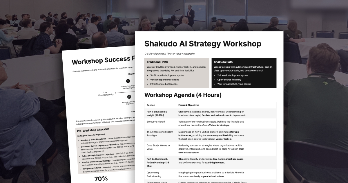 Stop letting AI projects get bogged down in DevOps, political roadblocks, and ballooning costs. This 2-page executive guide outlines the exact agenda and strategic framework Shakudo uses to bring your C-suite—the CTO, CFO, and COO—into complete alignment on AI initiatives in a single session. You'll move past endless POCs and identify the low-hanging fruit that delivers measurable business value and rapid time-to-value, all while securing executive buy-in for seamless execution in your own infrastructure.